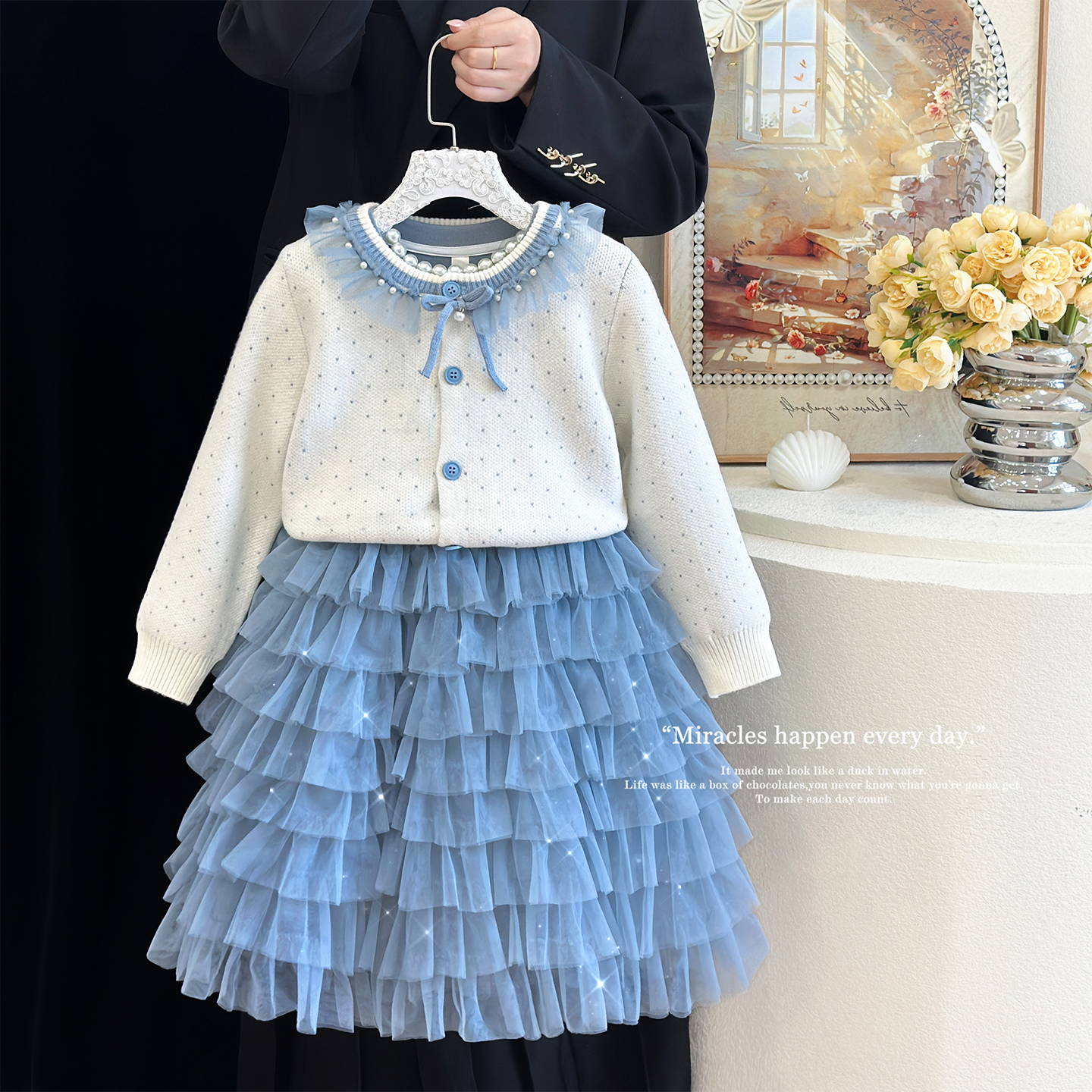 2025春秋款女童时尚连衣裙套装女宝宝长袖针织开衫花苞裙蓬蓬裙潮