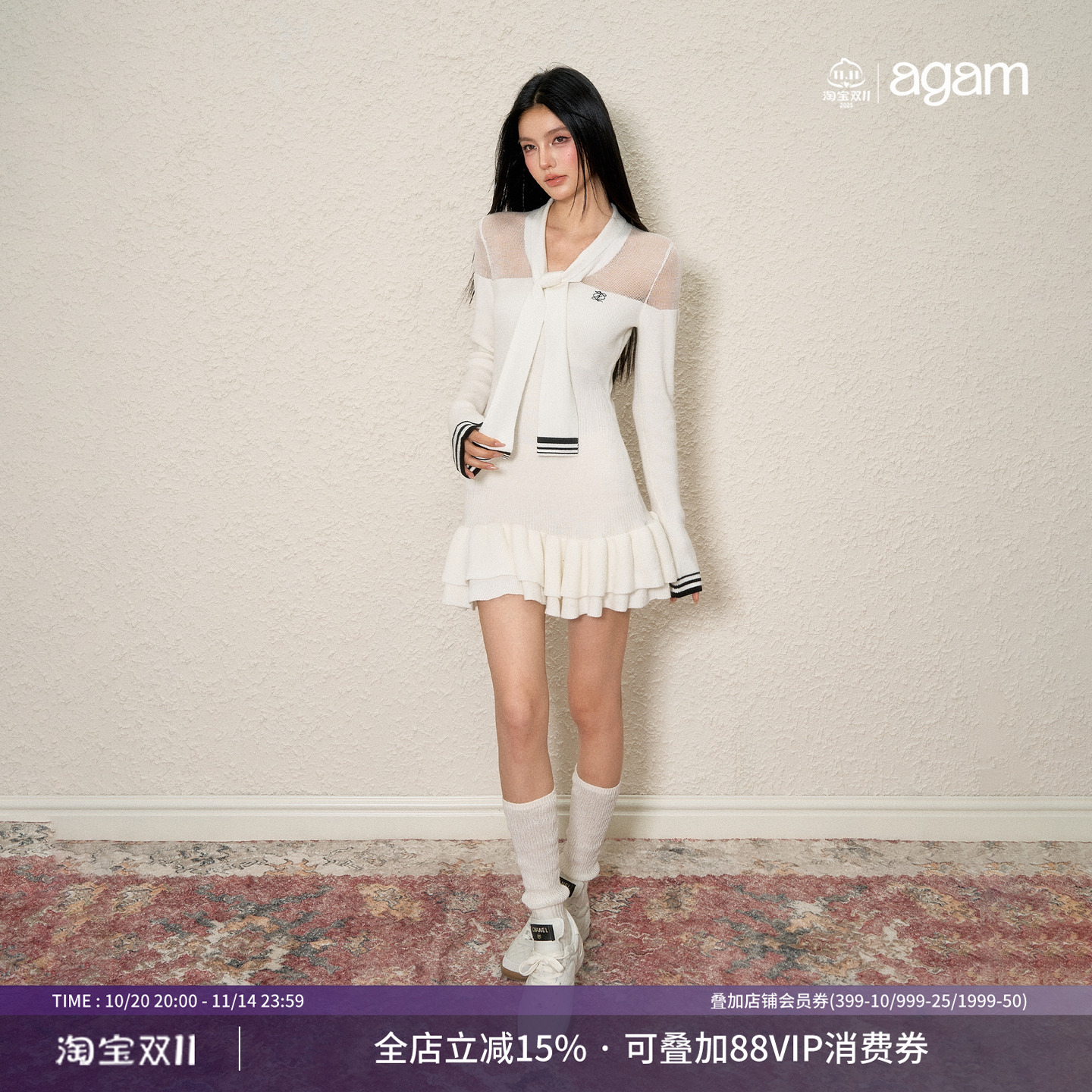 AGAM 原创设计纯欲风半透撞色绑带羊毛针织连衣裙修身蓬蓬短裙