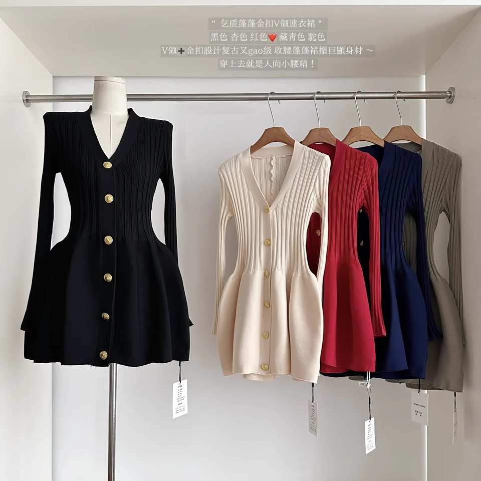 金扣设计V领蓬蓬针织连衣裙女秋冬气质高级感小香风打底毛衣裙子