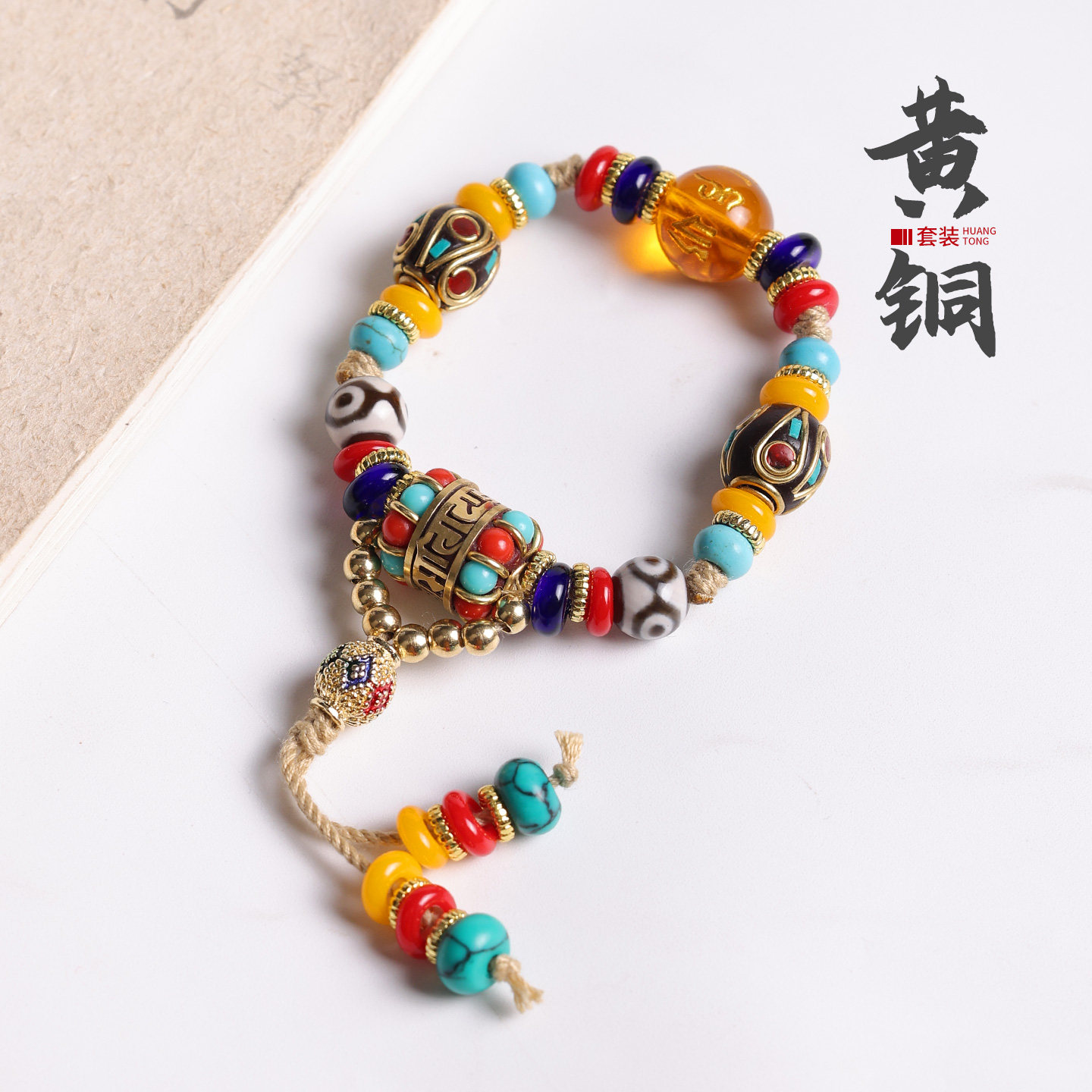 黄铜复古六字真言佛珠配饰佛头三通四件套装金刚星月菩提配饰套餐