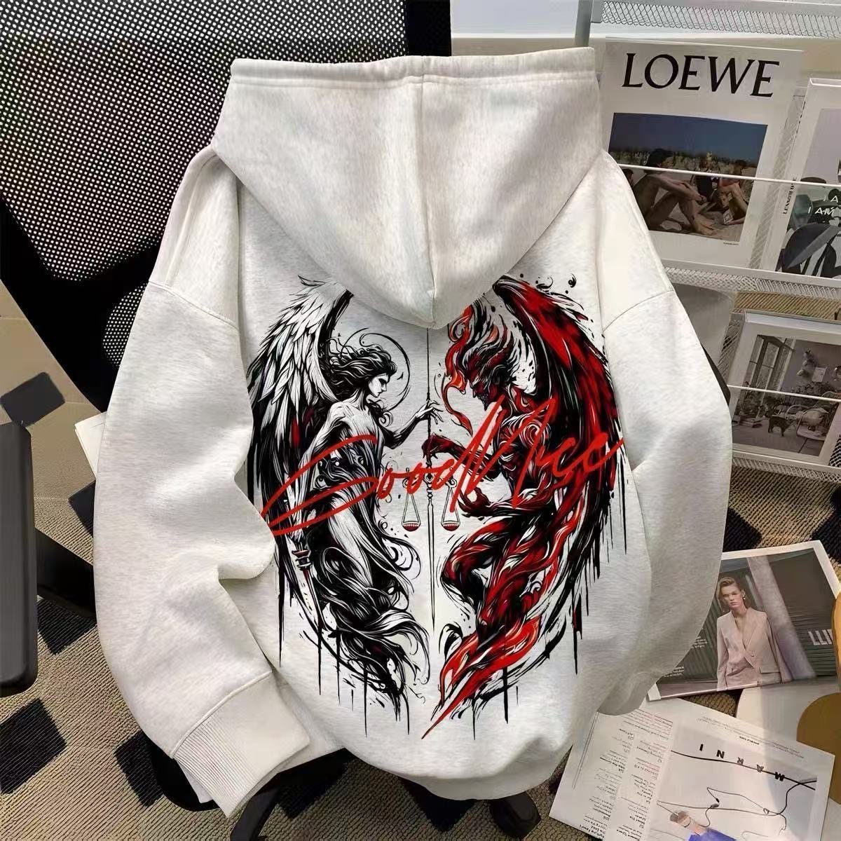 银狐绒美式复古天使翅膀印花连帽卫衣男女休闲秋冬款ins潮牌外套