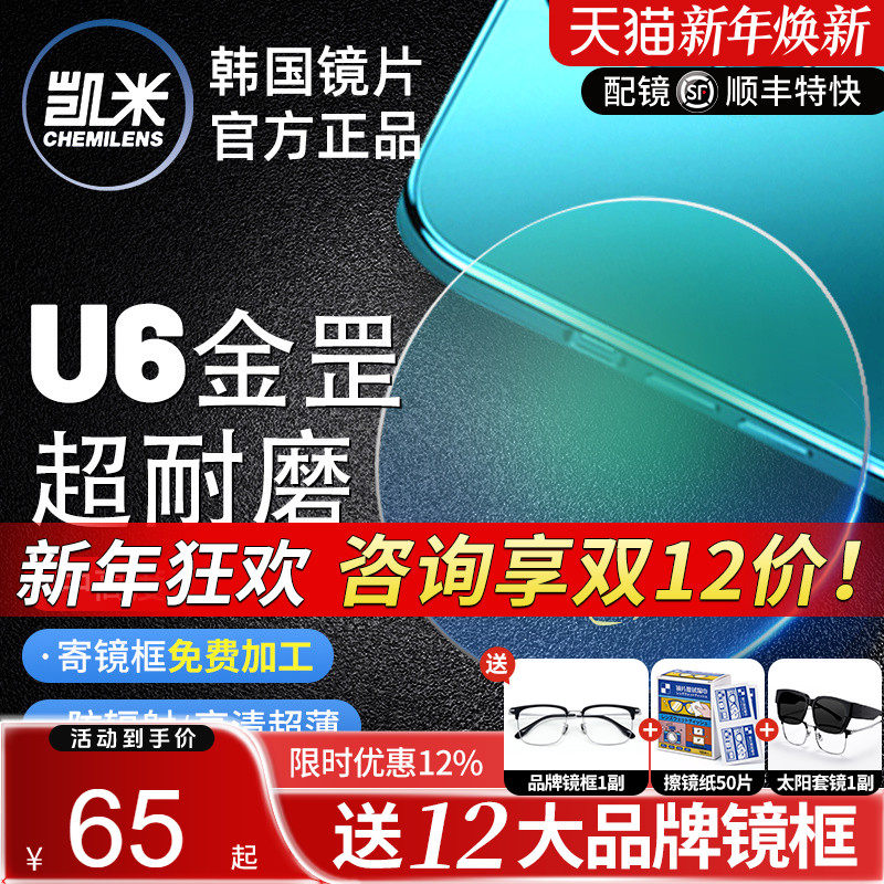 韩国凯米镜片U2超薄1.67防蓝光U6官方旗舰1.74高度数近视眼镜片