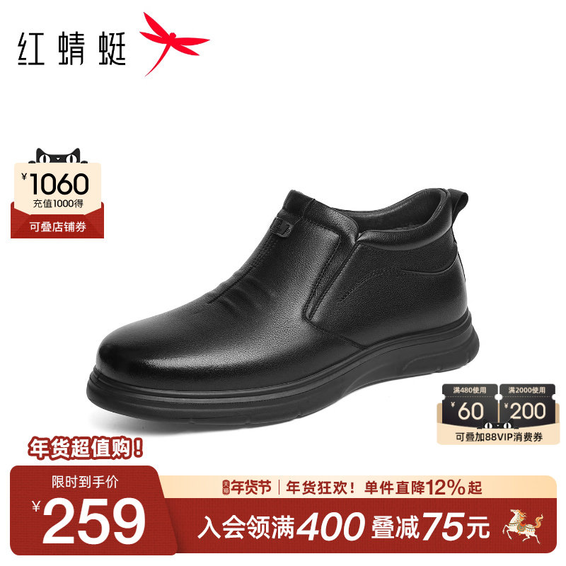 红蜻蜓男士棉鞋冬季新款男鞋真皮加绒保暖皮鞋中老年高帮爸爸鞋子