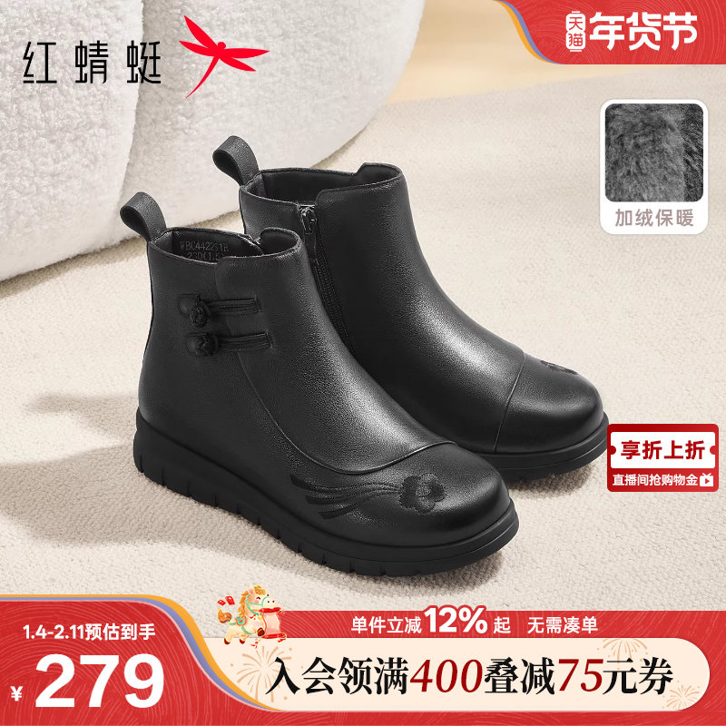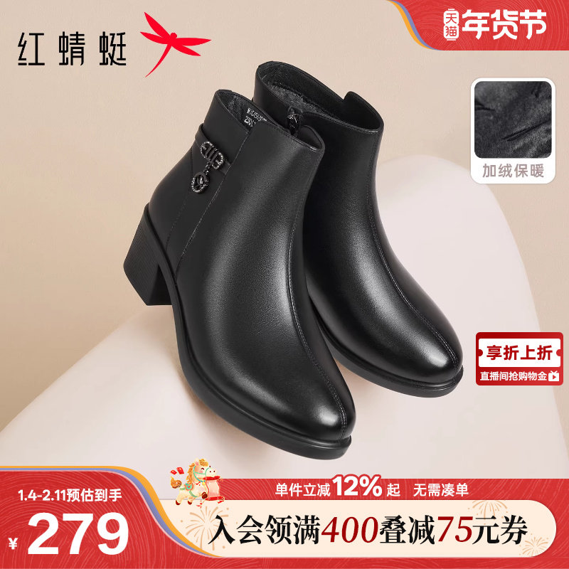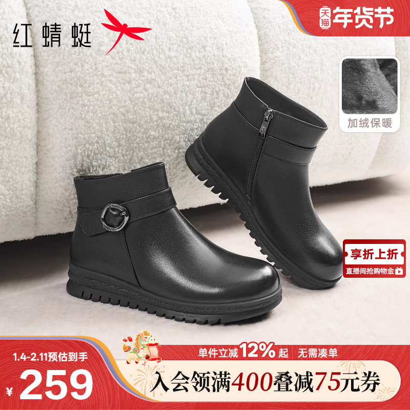 红蜻蜓妈妈鞋冬季新款女鞋靴子真皮加绒保暖皮鞋短靴中年女士鞋子