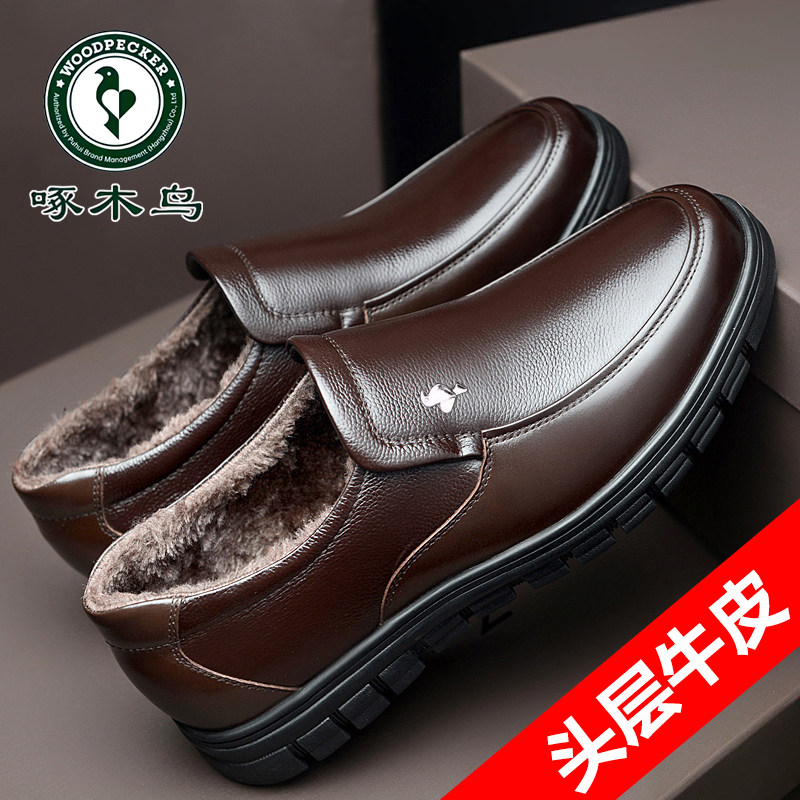 啄木鸟男鞋冬季加绒保暖皮鞋男士真皮牛皮软底防滑中老年爸爸棉鞋