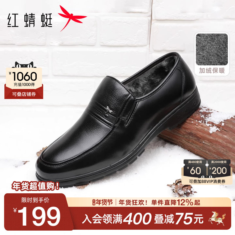 红蜻蜓男鞋冬季新款真皮休闲棉鞋男士爸爸鞋舒适软底加绒保暖皮鞋