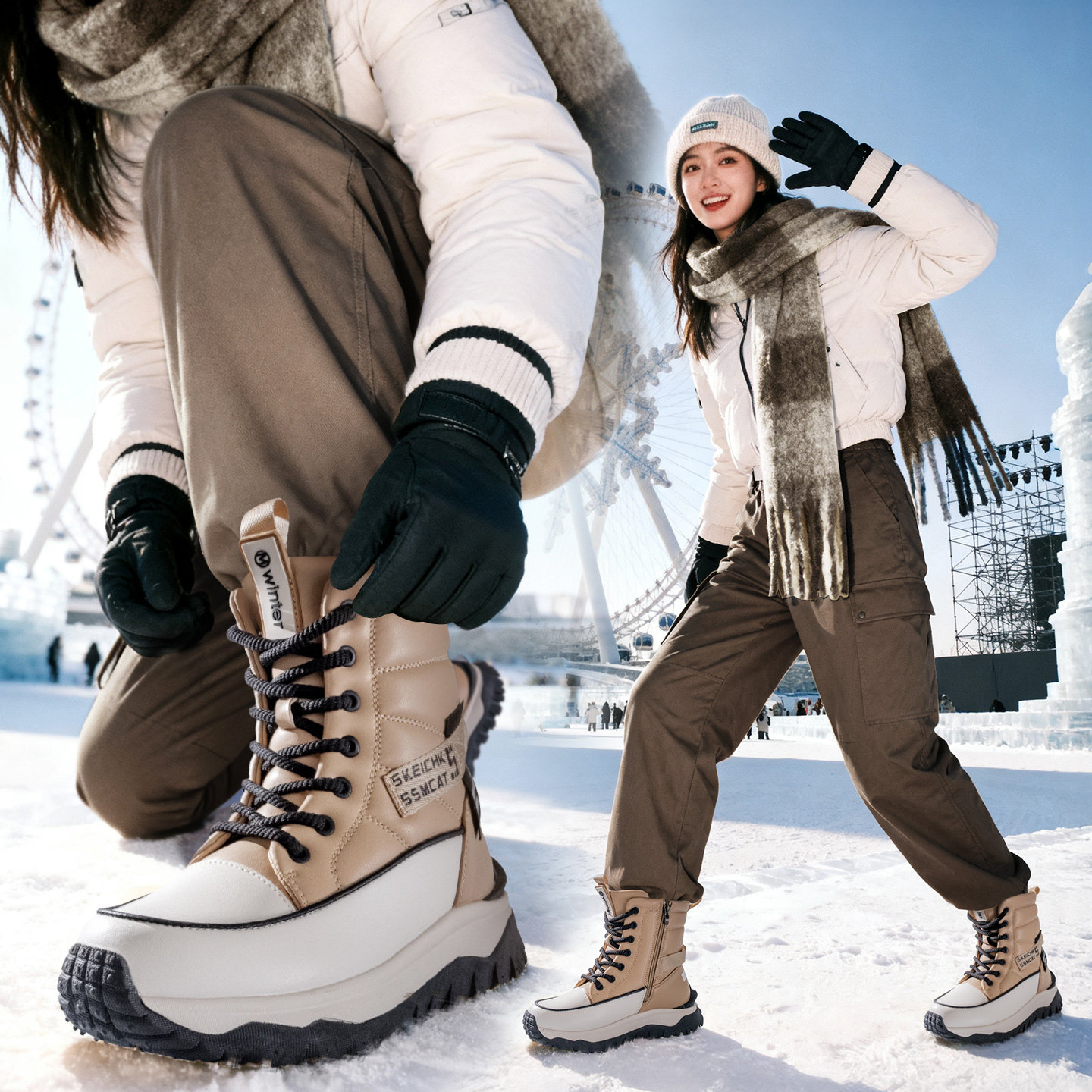 东北哈尔滨雪地靴女厚底冬季加厚保暖皮鞋防水防滑中筒防寒大棉靴