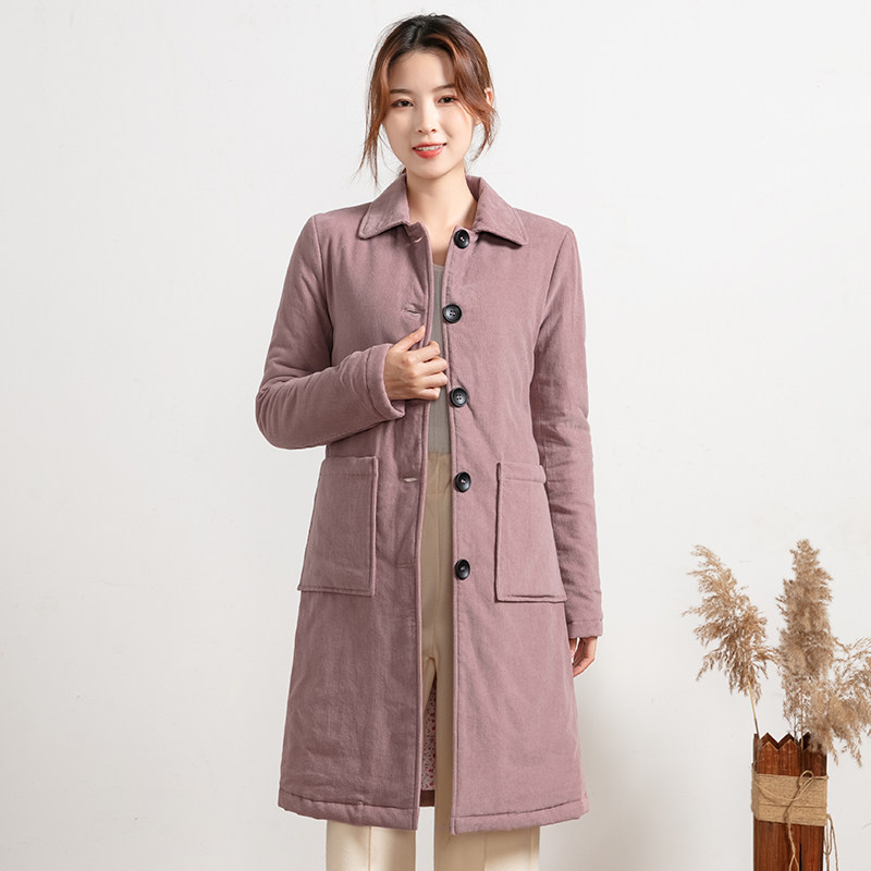 2022冬装新款棉衣女全棉灯芯绒纯色保暖显瘦单排扣口袋中长款棉服