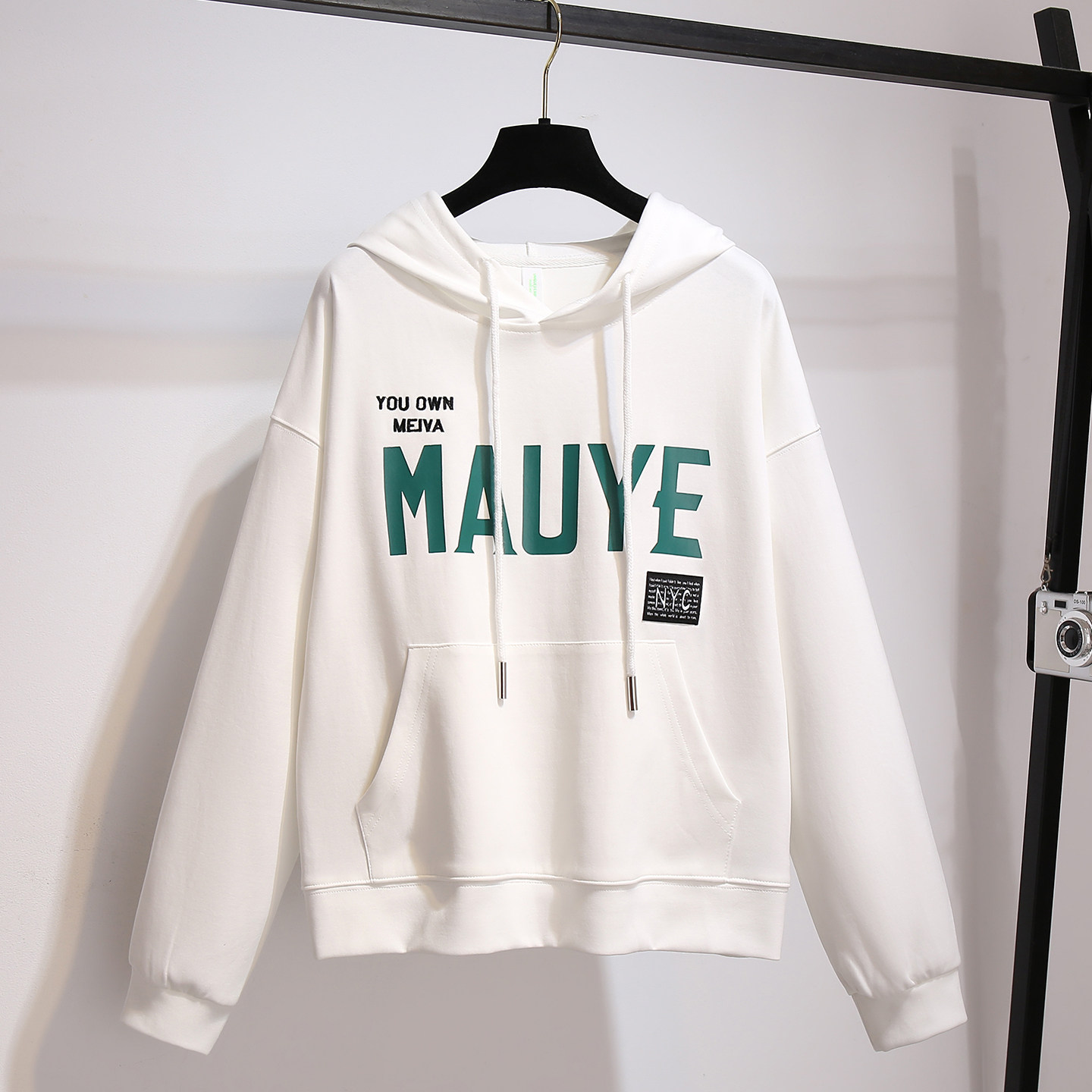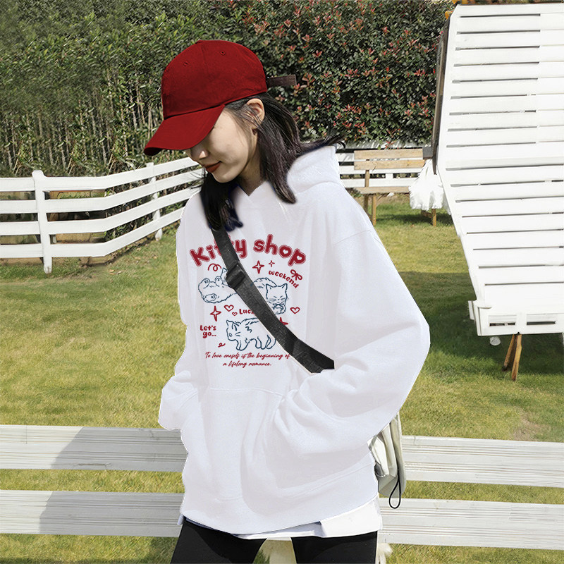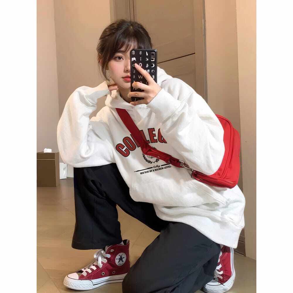 美式复古字母白色连帽卫衣女秋冬加绒加厚宽松学生带帽外套帽衫潮