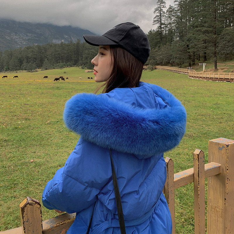 狐狸大毛领克莱因蓝羽绒服女冬季2025新款长款过膝连帽白鹅绒外套