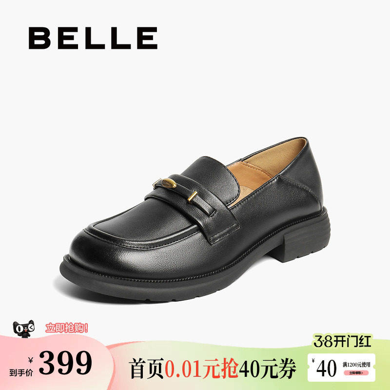 百丽乐福鞋女新款黑色小皮鞋两穿一脚蹬羊皮深口单鞋子E1N1DCA5