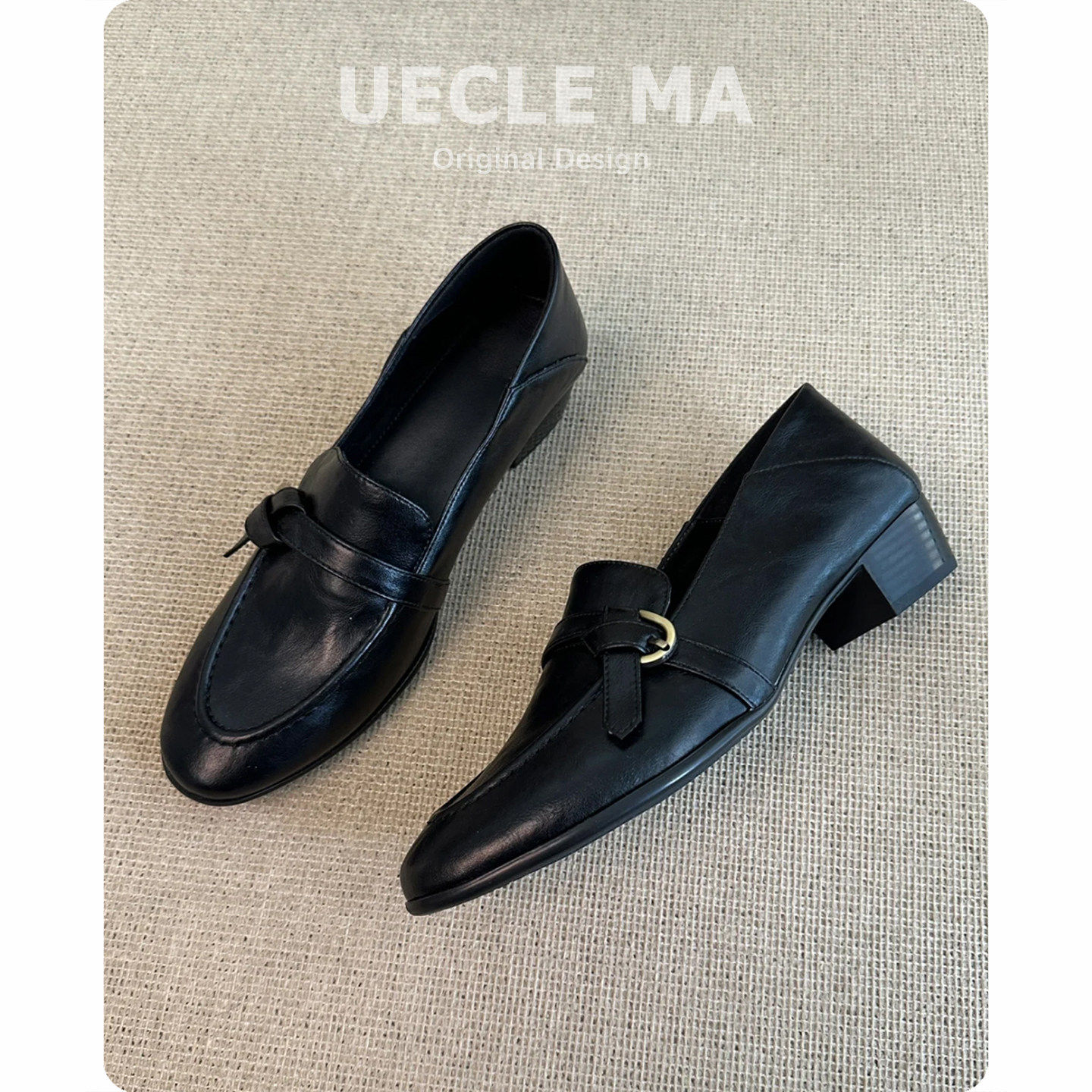 真皮~骄屿圆头一脚蹬小皮鞋英伦粗高跟气质百搭通勤单鞋女乐福鞋