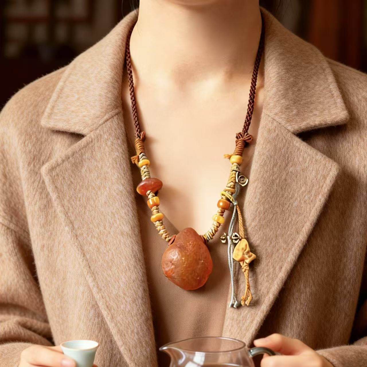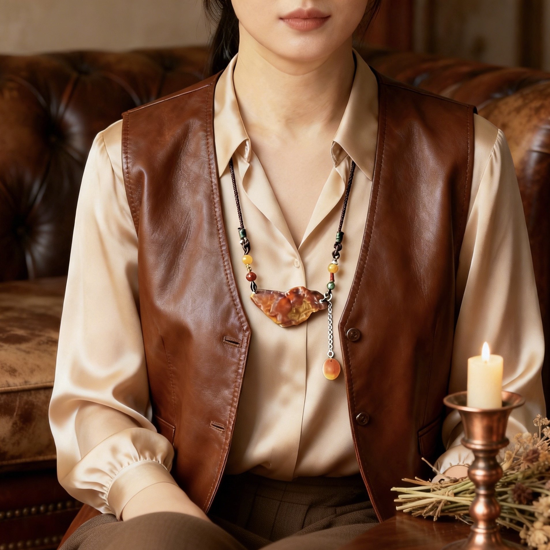 二姐家定制波罗的海琥珀蜜蜡原石设计藏式简约皮绳银绿松南红吊坠