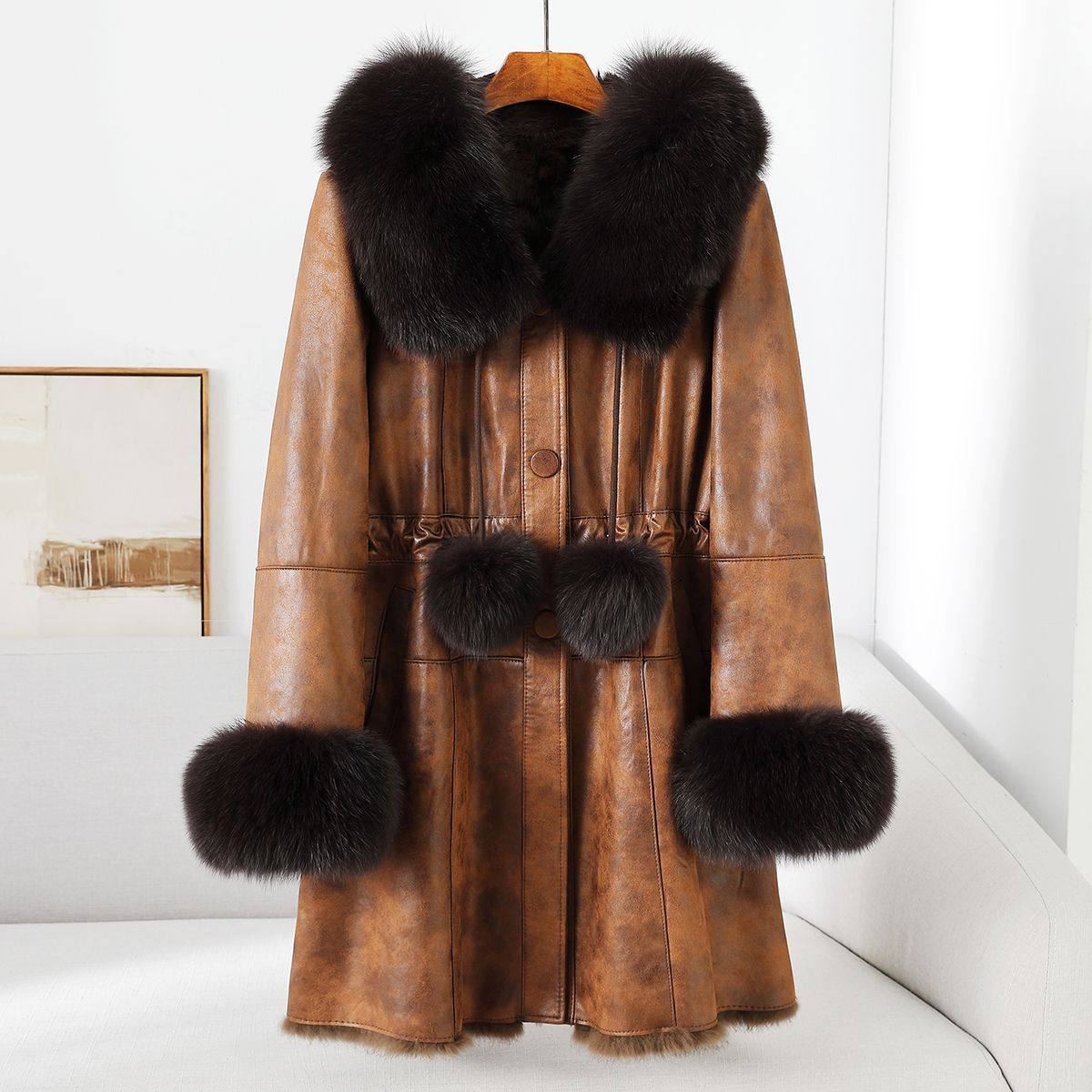 - 皮毛一体长款大衣女