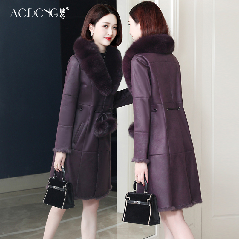 傲冬2022新款海宁真皮獭兔皮毛一体女中长款狐狸毛领修身皮草外套