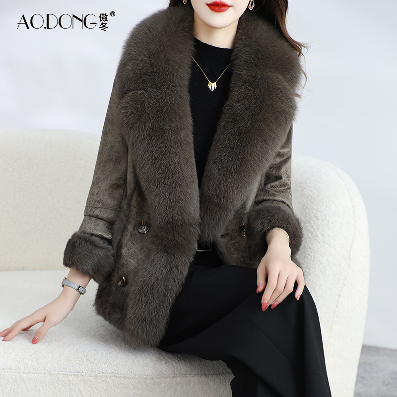 傲冬新款海宁兔皮毛一体女短款皮衣宽松皮草狐狸毛领保暖妈妈外套