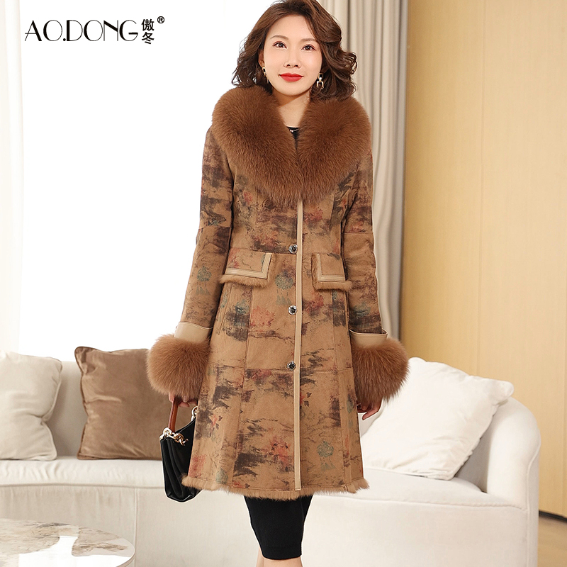 海宁兔皮毛一体女装大衣中长款皮衣狐狸毛领修身皮草印花妈妈外套