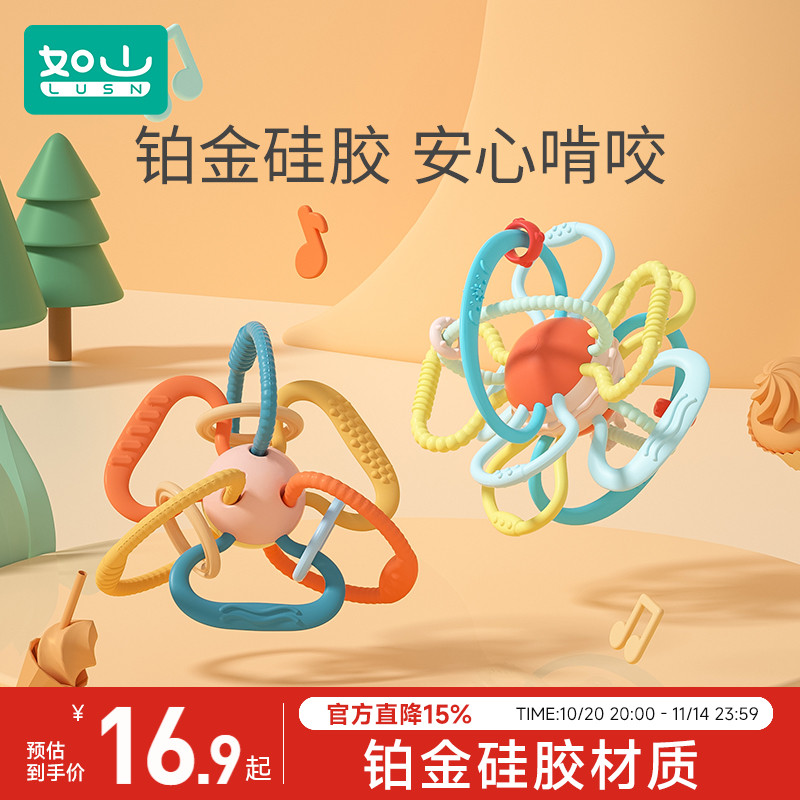 如山曼哈顿手抓球牙胶磨牙棒婴儿宝宝4-6个月3 5咬胶硅胶玩具可咬