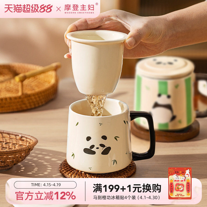 摩登主妇熊猫泡茶杯子马克杯办公室女士个人专用茶水分离陶瓷水杯