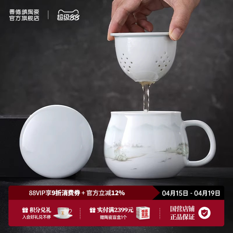 景德镇官方陶瓷玲珑马克杯子带盖家用泡茶杯大容量水杯茶漏杯礼物