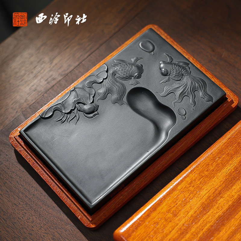 赋比兴 国家非遗 歙砚雕刻技艺《如鱼得水》歙砚老坑砚台 天然原石带盖歙砚台 安徽歙砚磨墨汁砚台 文房四宝