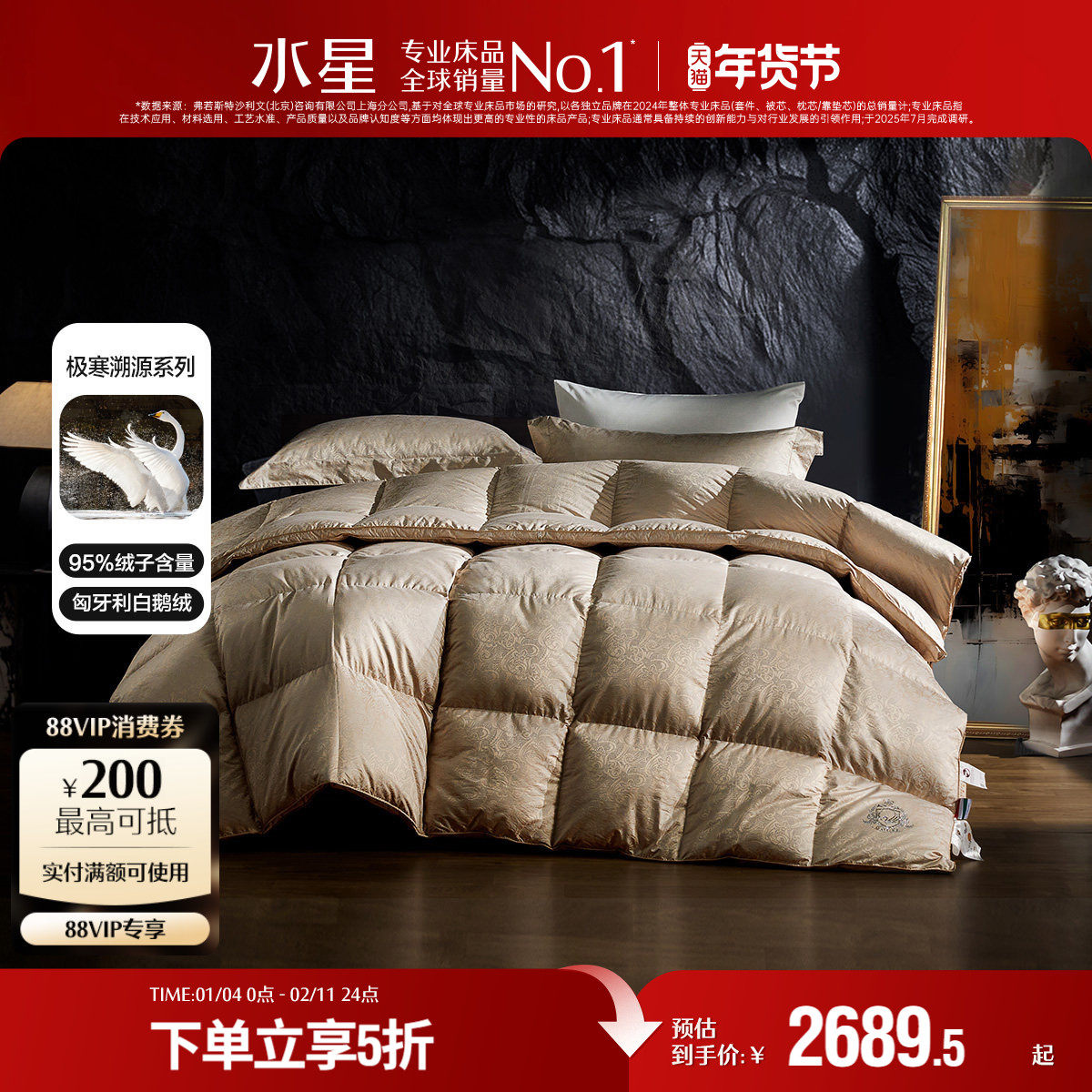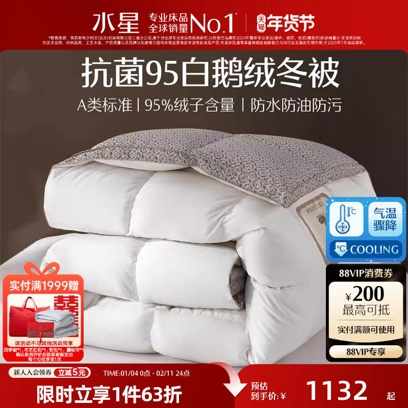 水星家纺被子95白鹅绒被A类冬被保暖抗菌单双人羽绒被芯年货送礼