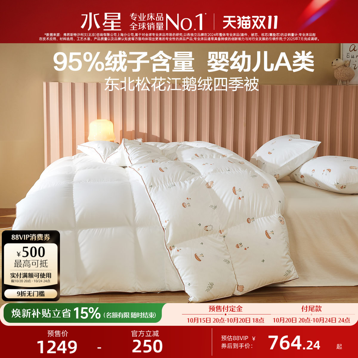 水星家纺进口95白鹅绒四季被子抑菌保暖儿童高端羽绒被芯2025新品