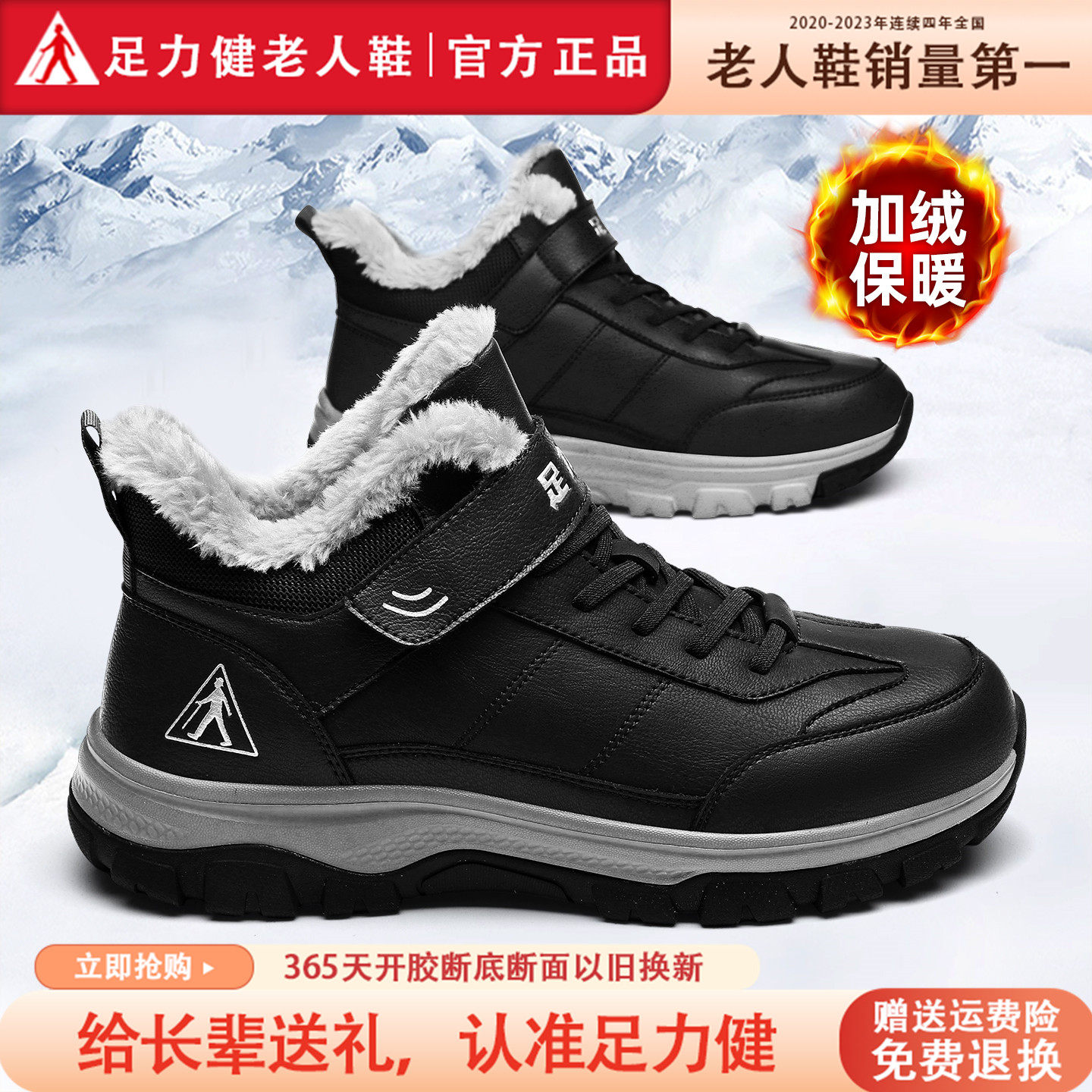 足力健老人鞋官方旗舰店正品男鞋冬季加绒雪地靴防滑中年爸爸棉鞋