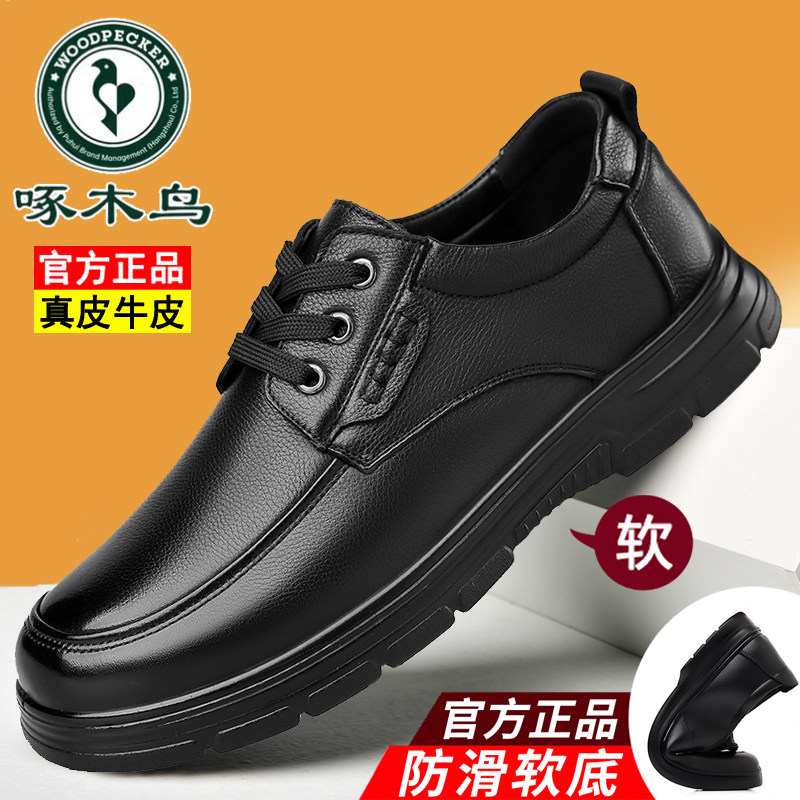 啄木鸟男鞋真皮牛皮商务休闲皮鞋男软底中老年爸爸鞋冬季保暖棉鞋