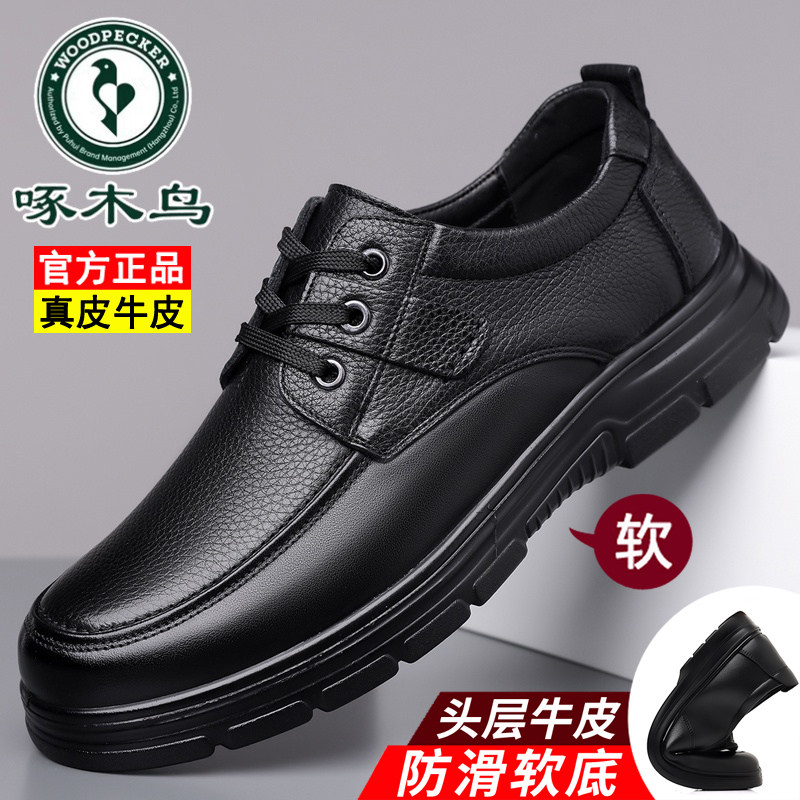 啄木鸟男鞋真皮商务休闲皮鞋男软底防滑中老年爸爸鞋冬季保暖棉鞋