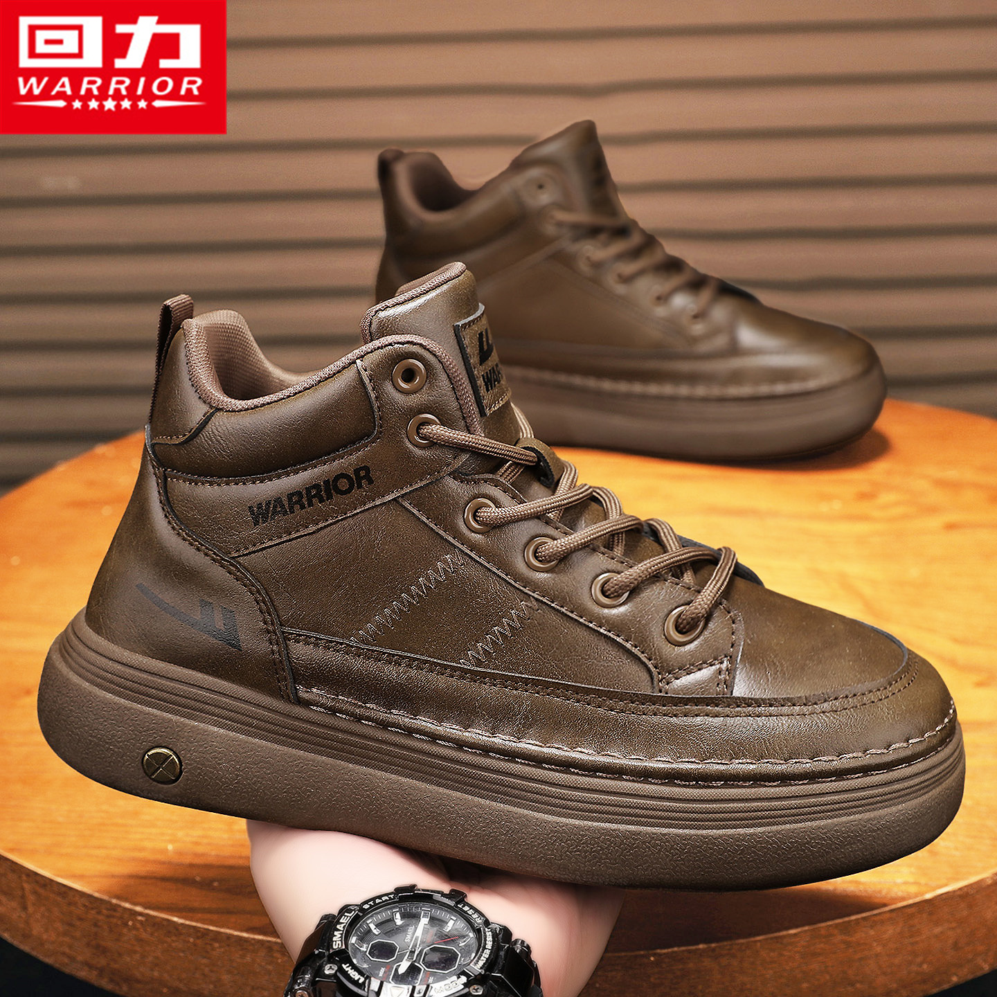 回力高帮男鞋秋季青少年防水棕色皮鞋休闲鞋运动厚底上班工作板鞋