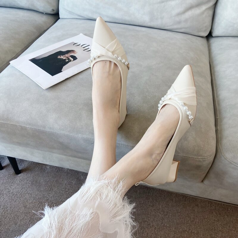 羊皮版~法式尖头珍珠细跟单鞋女2026新款不累脚高跟浅口伴娘婚鞋