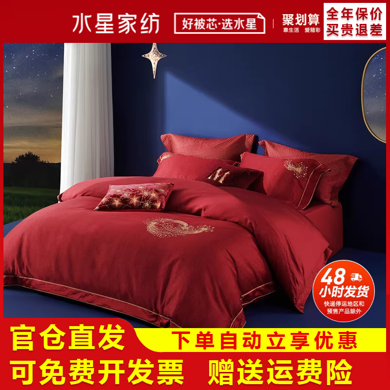 水星家纺140S双股长绒棉四件套红色全棉色织提花刺绣结婚喜庆床品
