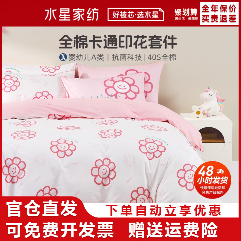 水星家纺A类抗菌全棉三/四件套儿童套件粉色被套床单床品24年新品