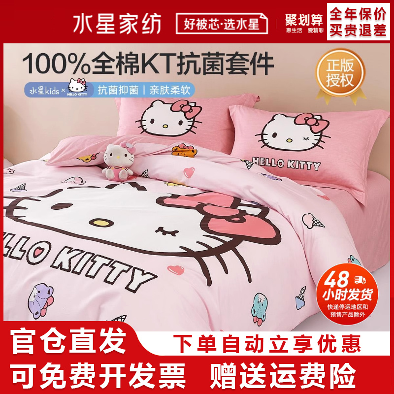 水星家纺全棉四件套A类抗菌套件女生儿童卡通KT被套床单款床笠款