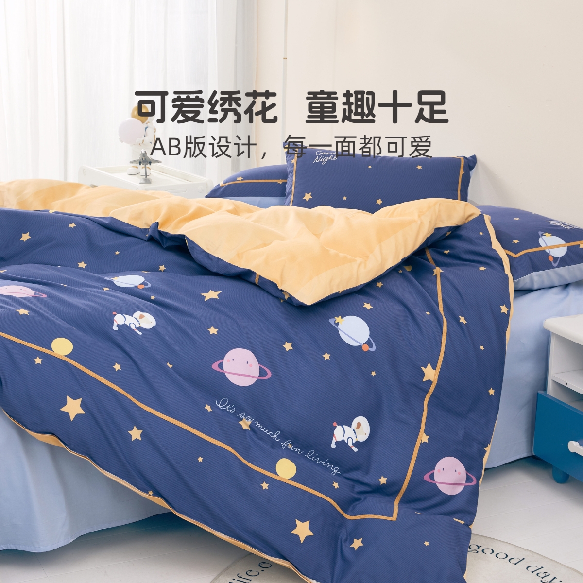 水星家纺60S长绒棉磨毛三四件套母婴A类保暖儿童冬季床品星球传说