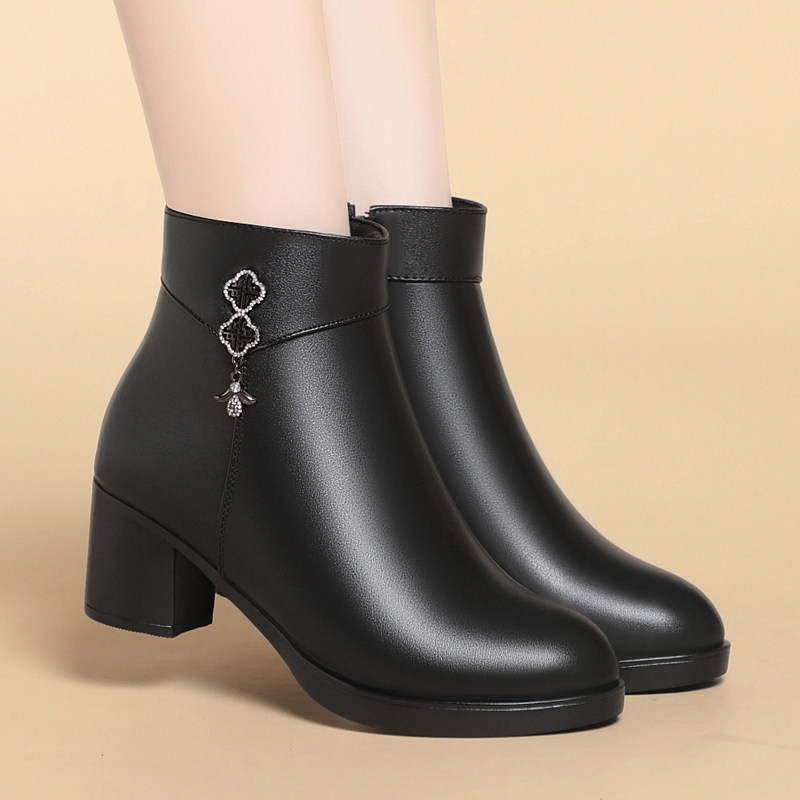 冬季保暖加绒低中粗跟厚羊毛妈妈棉鞋短靴女士真皮棉鞋女式棉皮鞋
