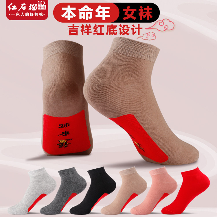 女士本命年袜底红色马年短筒纯棉女袜四季款防臭棉袜喜庆大红袜子