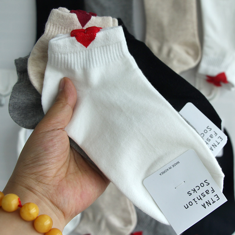 春夏秋四季女袜子纯棉短筒袜韩国简约可爱桃心黑色白色透气吸汗袜