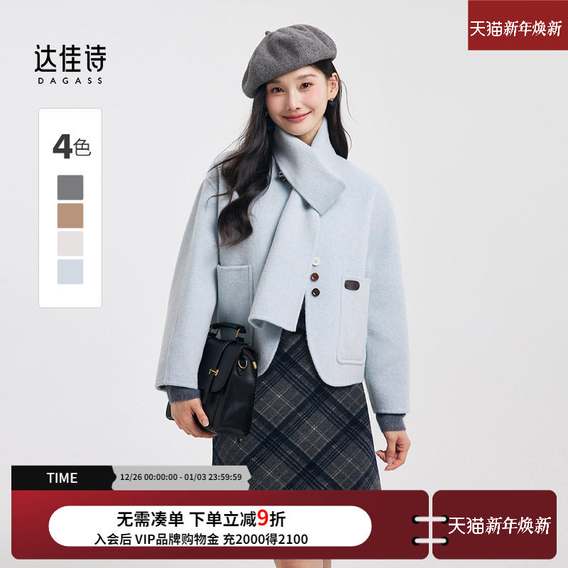 达佳诗蓝色双面呢围巾大衣女款2025新款秋季短款毛呢小个子外套