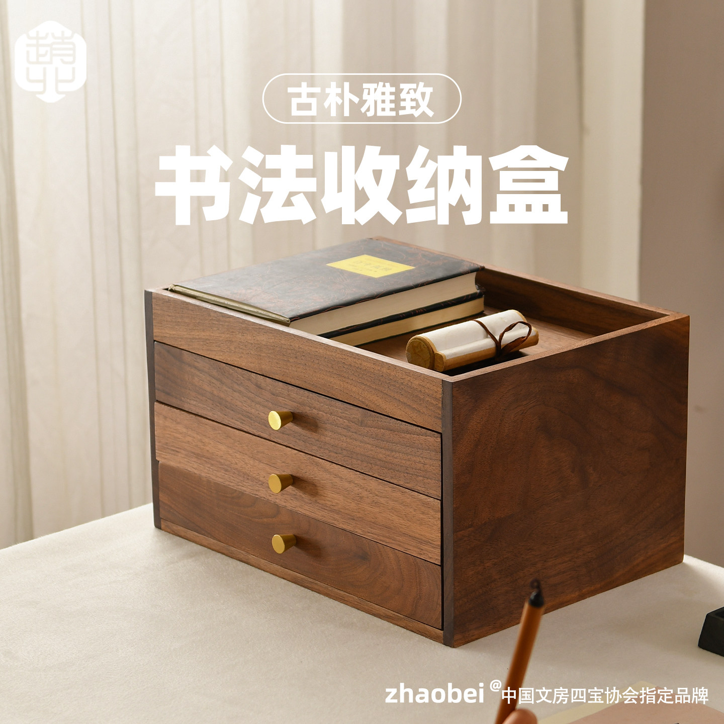 赵北文房摆件胡桃木收纳盒实木整理置物架多功能书画工具收纳文房四宝礼品新中式书桌文盘文玩摆件展示文盘