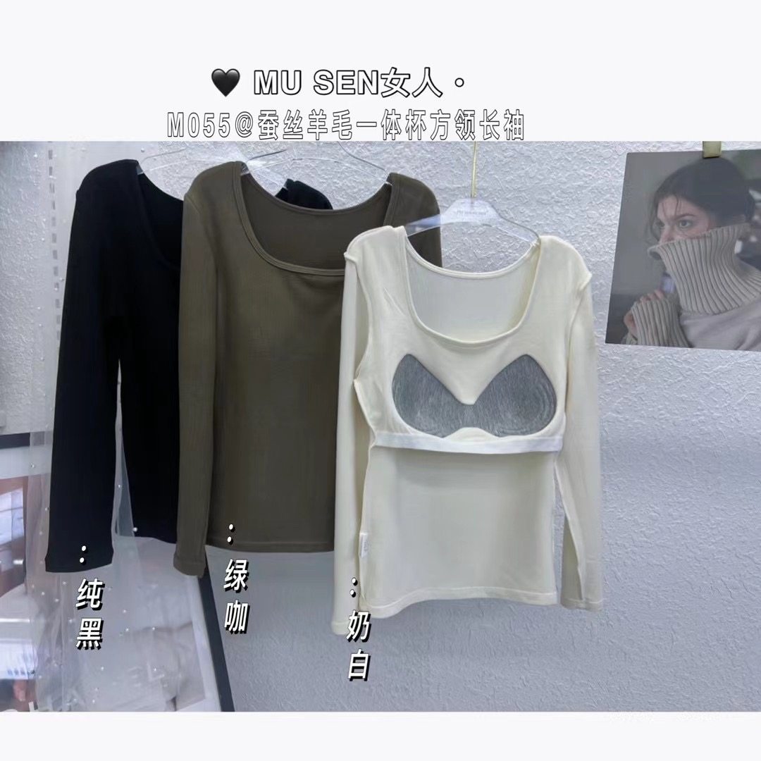 木森女人M055秋冬羊绒四方领长袖保暖上衣女固定一体杯发热打底衫