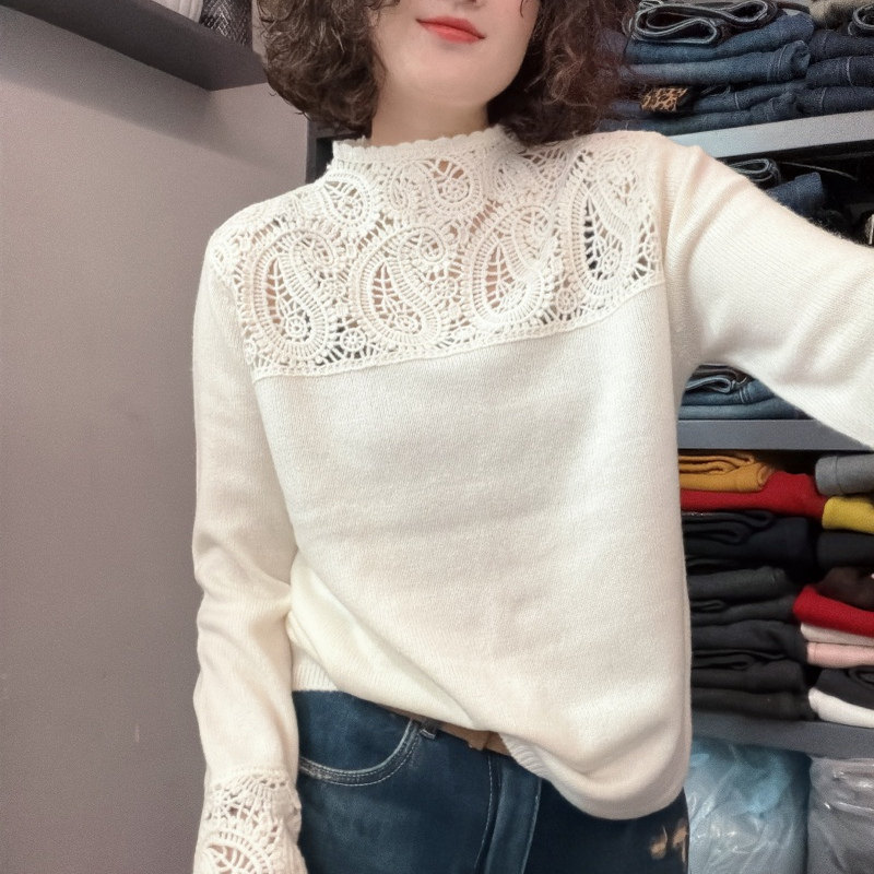 100%山羊绒 法式优雅女人 蕾丝花瓣领重工刺绣打底羊绒针织衫毛衣