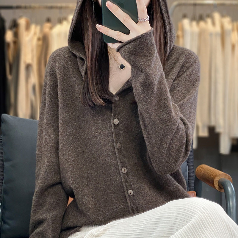 澳洲美丽诺100纯羊毛针织衫女一线成衣无缝连帽开衫羊绒毛衣外套