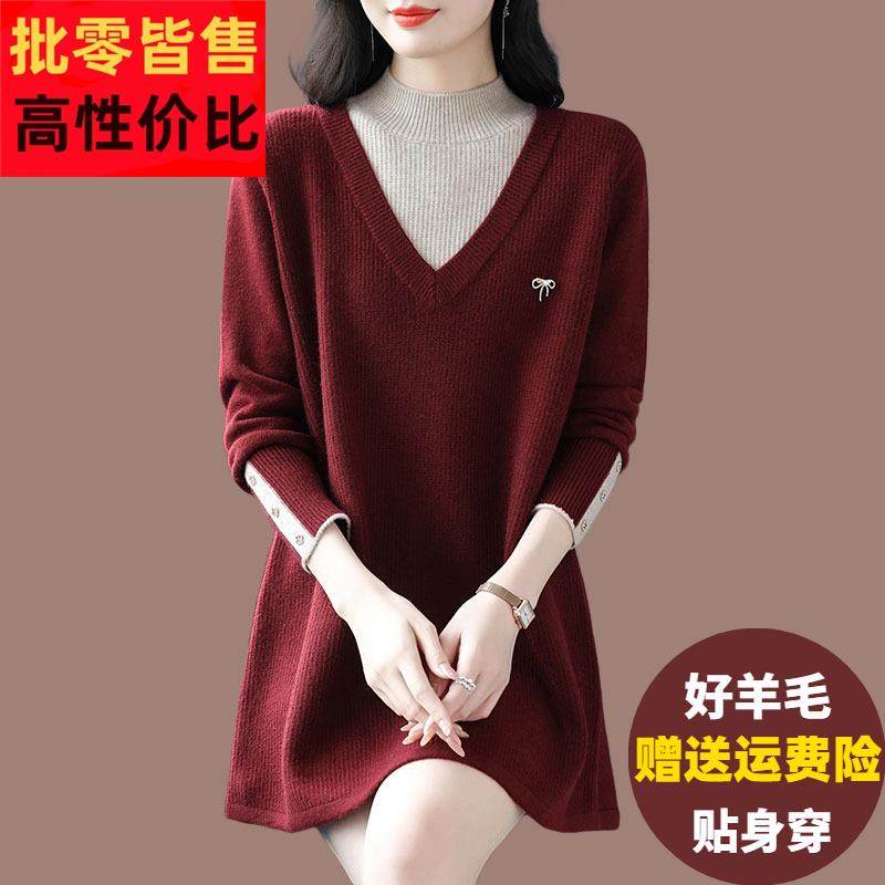 秋冬中长版羊毛衫毛衣加大码宽松时尚洋派胖女人假两件羊绒打底衫