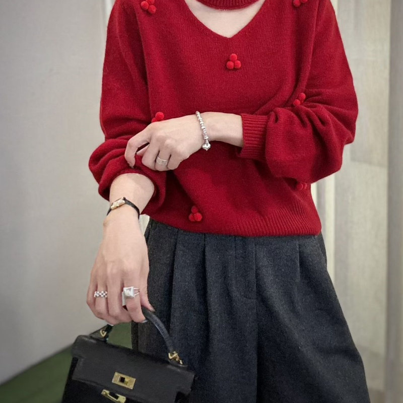 女人味胸口镂空挂脖羊绒针织衫女2025冬季新款圣诞红立体毛球毛衣