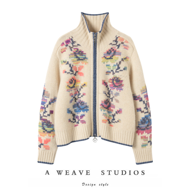 欧洲站2025年冬季新款时尚钩花女人味山羊绒针织衫女立领软糯毛衣