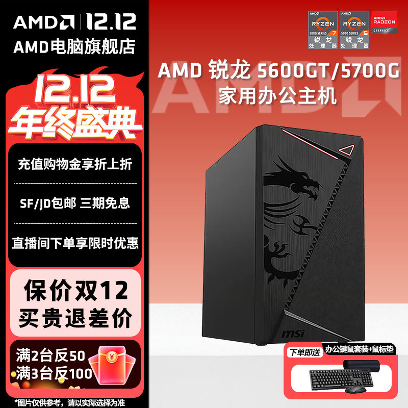AMD锐龙R5 5600GT/5700G商用办公家用网课财务企业采购设计台式电脑游戏主机DIY组装机Ai电脑办公LOL电竞