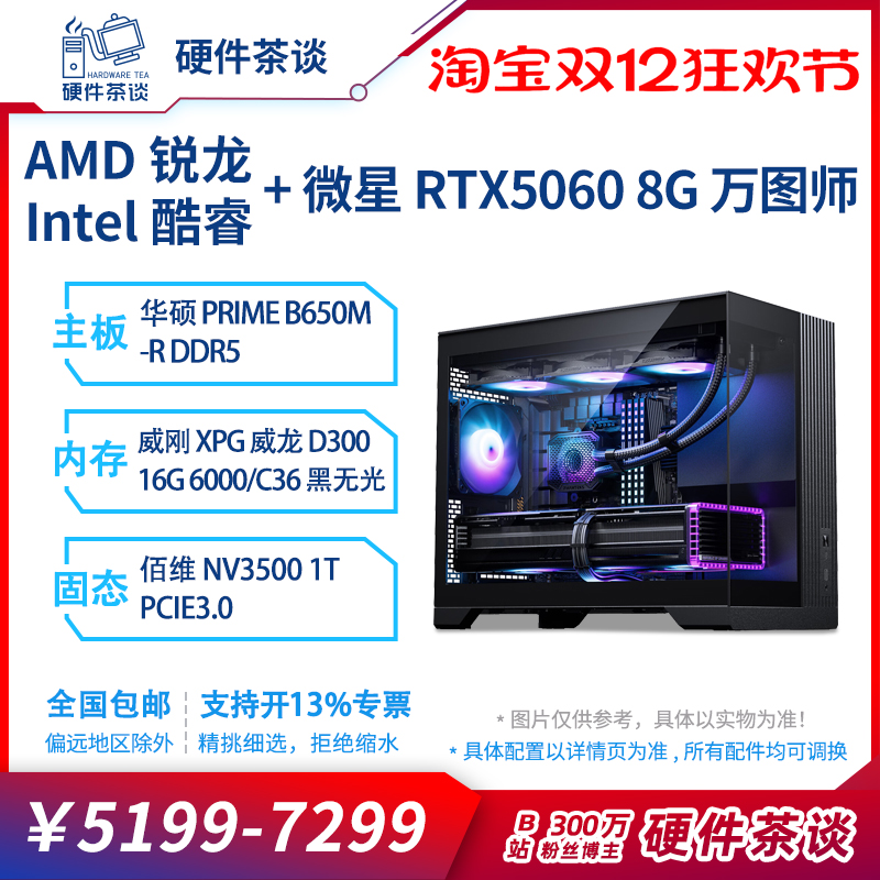 AMD锐龙R5 9600X/9700X/9800X3D/5060TI 16G/5060 8G台式电脑N卡游戏电竞主机DIY组装机吃鸡永劫悟空CSGO整机