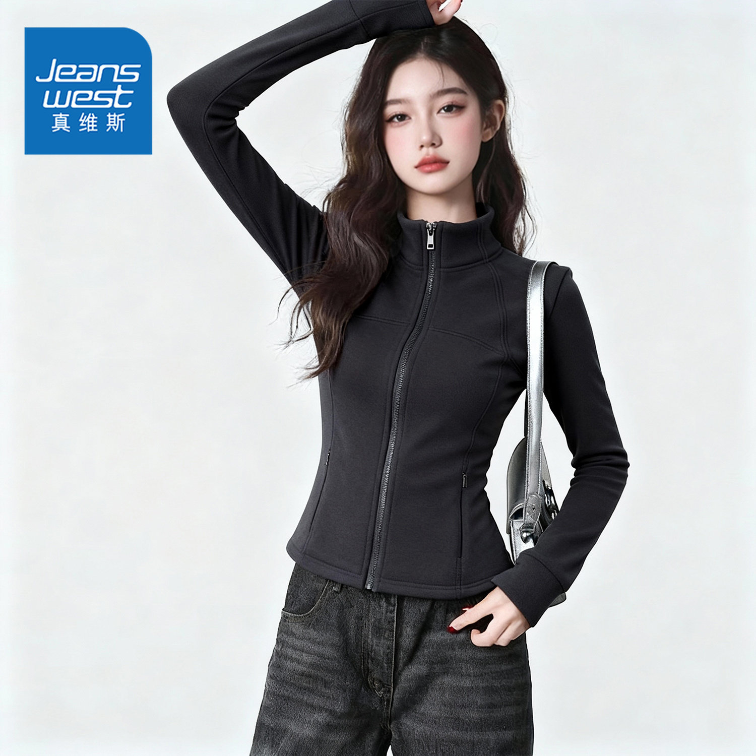 真维斯黑色立领摇粒绒外套女2026新款秋冬修身冲锋衣内胆抓绒衣W